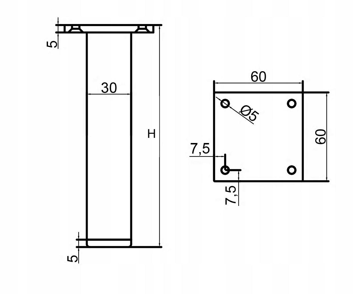 - Przekrój stopki – Kwadrat 30x30 mm